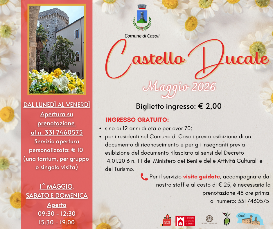 Il Castello Ducale di Casoli apre le sue porte per il mese di maggio 2026. Ingresso a soli 2 euro, gratuito per bambini fino a 12 anni, over 70, residenti e insegnanti. Disponibili anche visite guidate con accompagnatore su prenotazione.